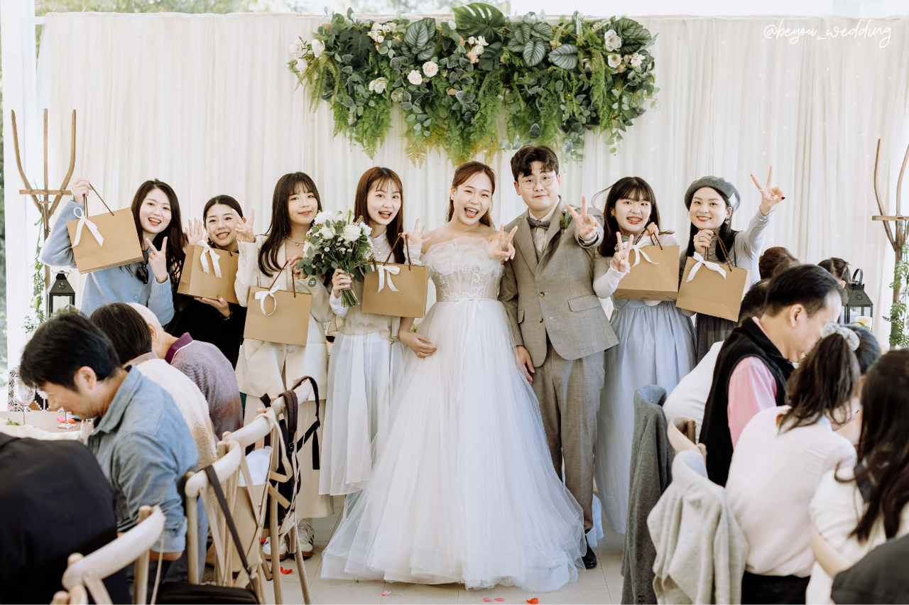 針對比較害羞的朋友可以將要給的禮物放在位置上或是放在新娘房裡交給好姐妹。若為比較敢上台的朋友,可以搭配捧花活動將禮物贈送給身旁的好姐妹。