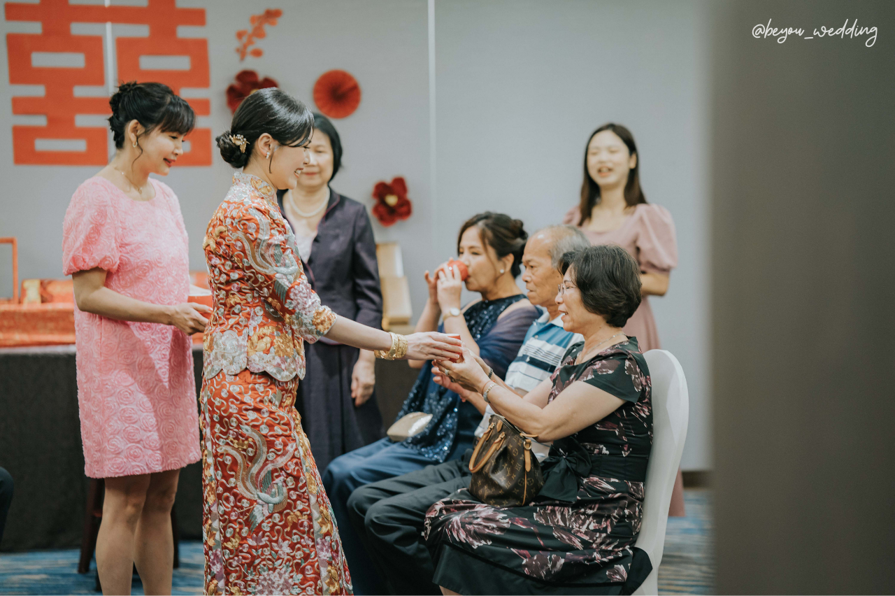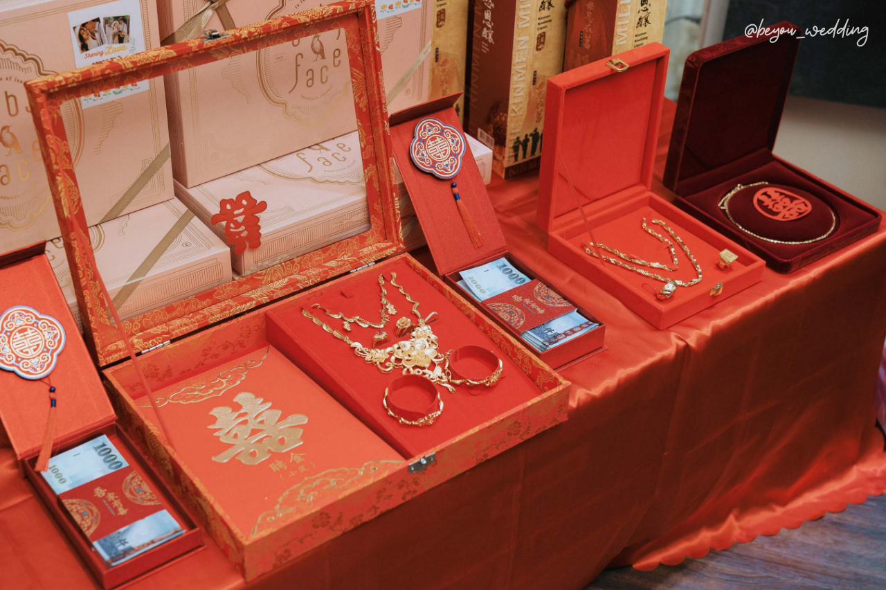 儀式流程:可依家庭狀況簡化,常見流程如奉茶、交換戒指、穿金戴銀、交換聘禮等。